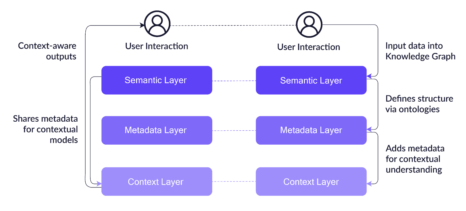 A visual illustration of a generative AI knowledge architecture is shown below. The diagram illustrates how data input by a user flows through the three core layers of an AI-based system. The semantic layer processes the input data from the user and creates a knowledge graph with the entities and their associated attributes. The metadata layer determines the structure and relationships among the various entities. The semantic layer then shares the knowledge graph and metadata with the context layer. It is the context layer that adds real-time awareness by considering factors that influence how the input data should be interpreted (i.e., context-sensitive inputs).