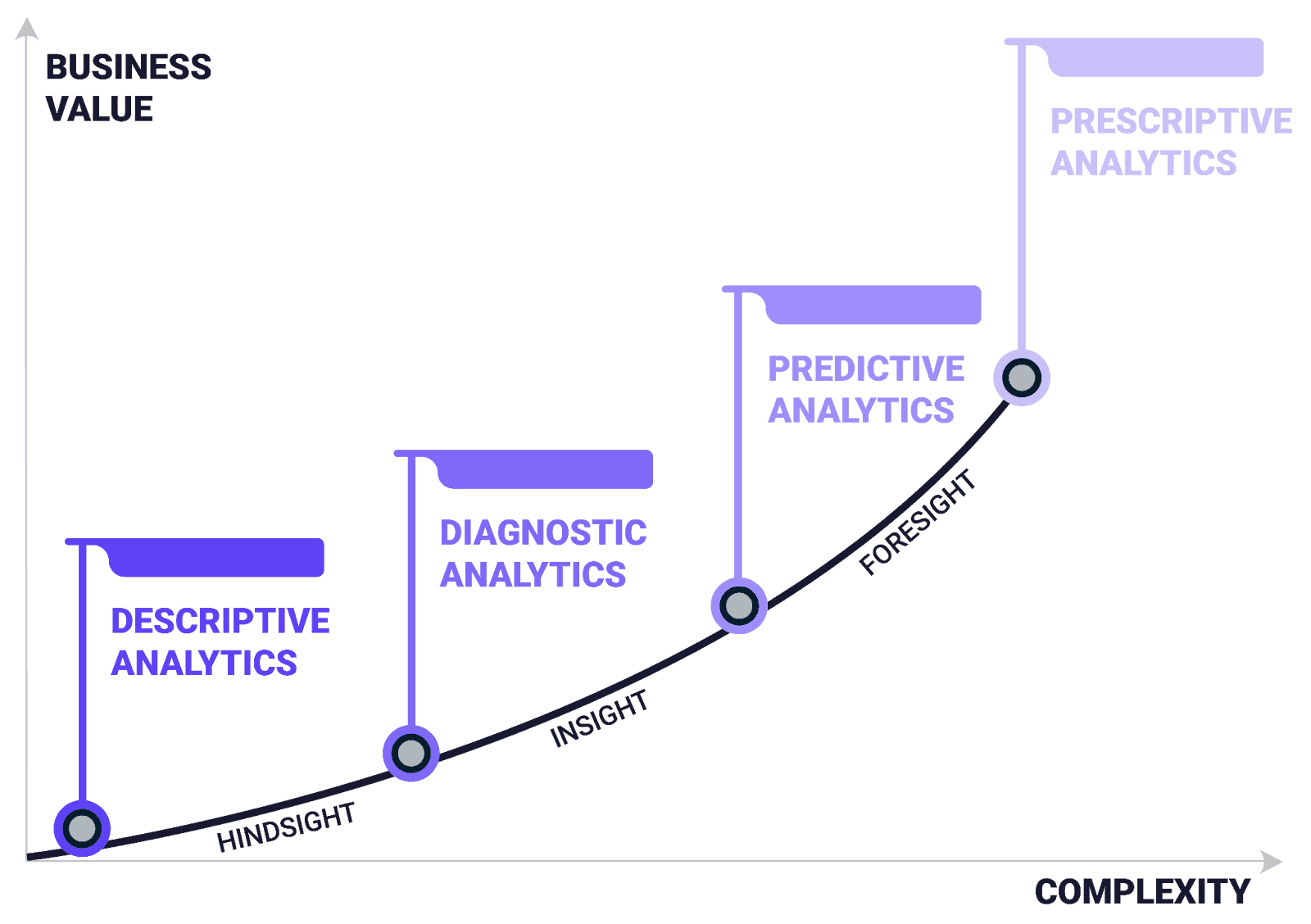 Uses historical data and models to know “what might happen next”; commonly involves statistical forecasting and machine learning | Forecasting | Vulnerable to model drift, data shifts can require extensive feature engineering and iterative model tuning | |