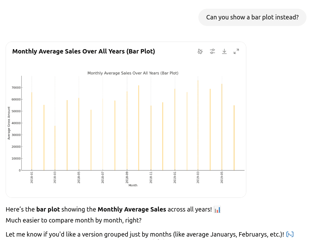 In the following screenshot, we ask ChatGPT to generate a chart showing the average monthly sales for all the years in the data file.