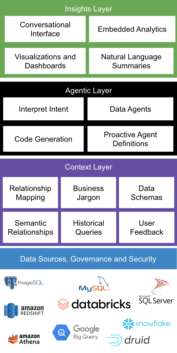 A genBI system's core app layer capabilities are built on a modular, layered architecture. As illustrated in the diagram below, the Data Sources, Governance, and Security layer forms the foundation, ensuring connectivity to trusted enterprise data. Above it, the Context Layer provides the data with semantic understanding, schema knowledge, historical queries, and user feedback, creating a shared “enterprise memory.” Then, the Agentic Layer interprets user intent, generates code or queries, and orchestrates data agents that proactively surface insights. At the top, the Insights Layer transforms this intelligence into valuable insights for the user through conversational interfaces, dashboards, analytics, and natural language summaries.