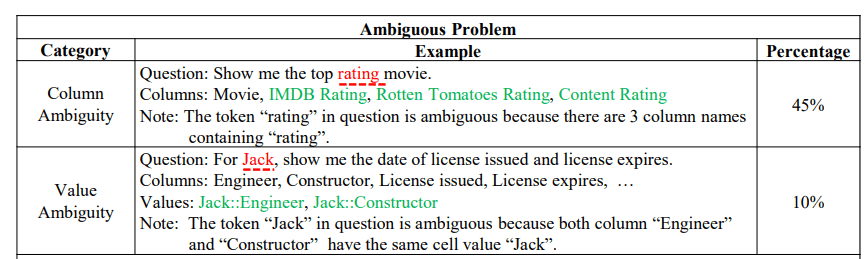 In the text-to-SQL task, ambiguity means that one user query could have multiple semantic meanings based on one table. Given the inherent ambiguity of natural language, resolving ambiguity is one of the most formidable challenges in text-to-SQL systems. A question such as “Show me the top-rated movie” could be related to various columns inside the database, requiring that models detect and resolve these ambiguities to prevent erroneous queries.