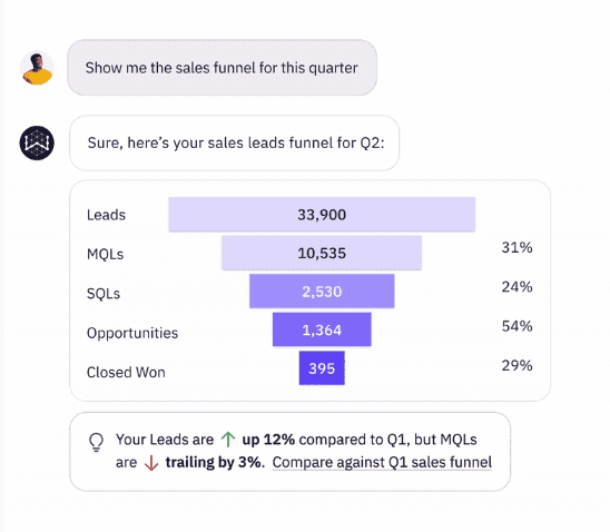 When the user provides more information, such as "I want to compare it to last quarter's revenue," the LLM creates a more complicated SQL query for that analysis.