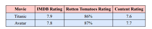 Column ambiguity occurs when a token in the query can be associated with multiple columns. The term “rating” may refer to “IMDB Rating,” “Rotten Tomatoes Rating,” or “Content Rating” in this example. For instance, based on the table below, a possible query is:
